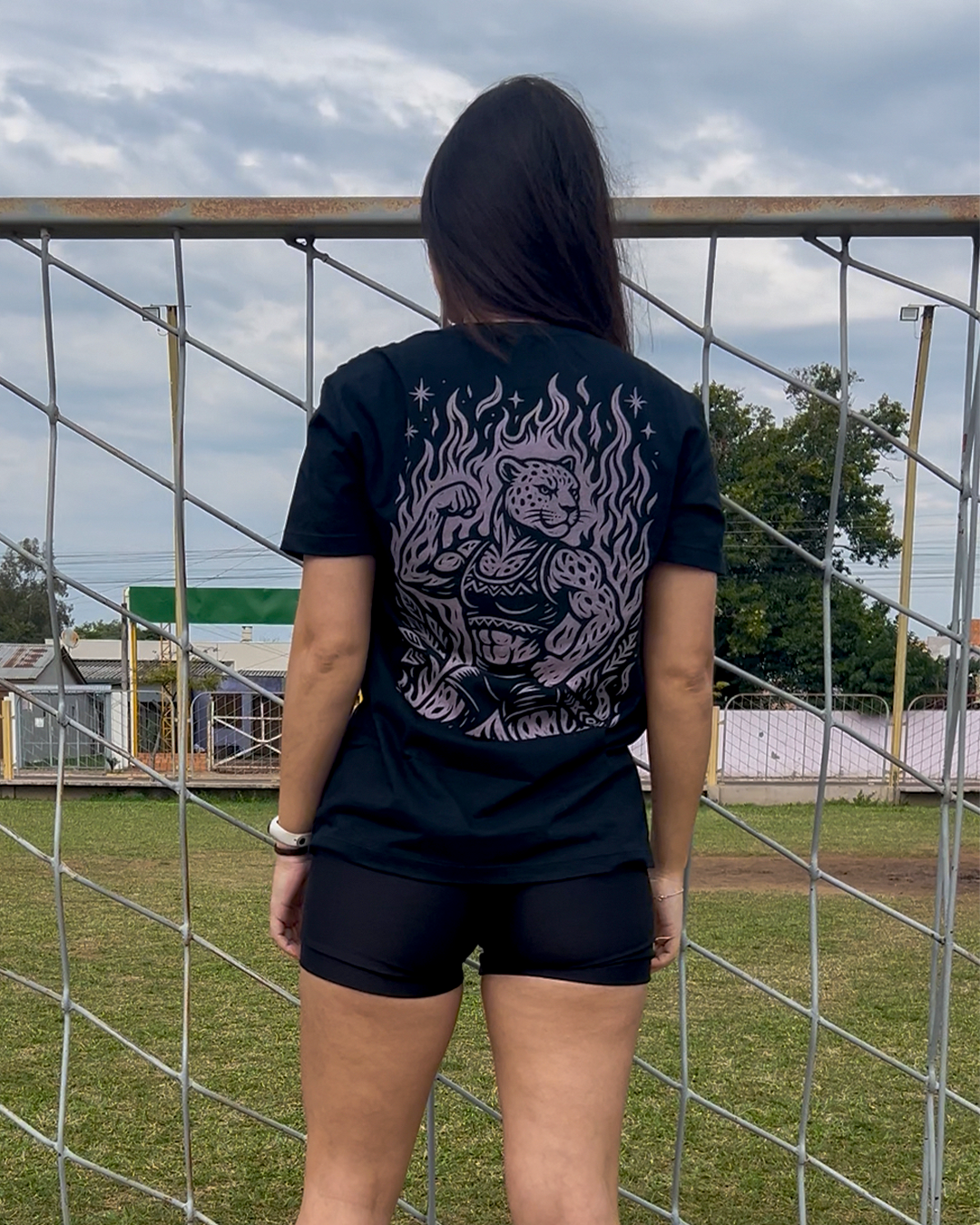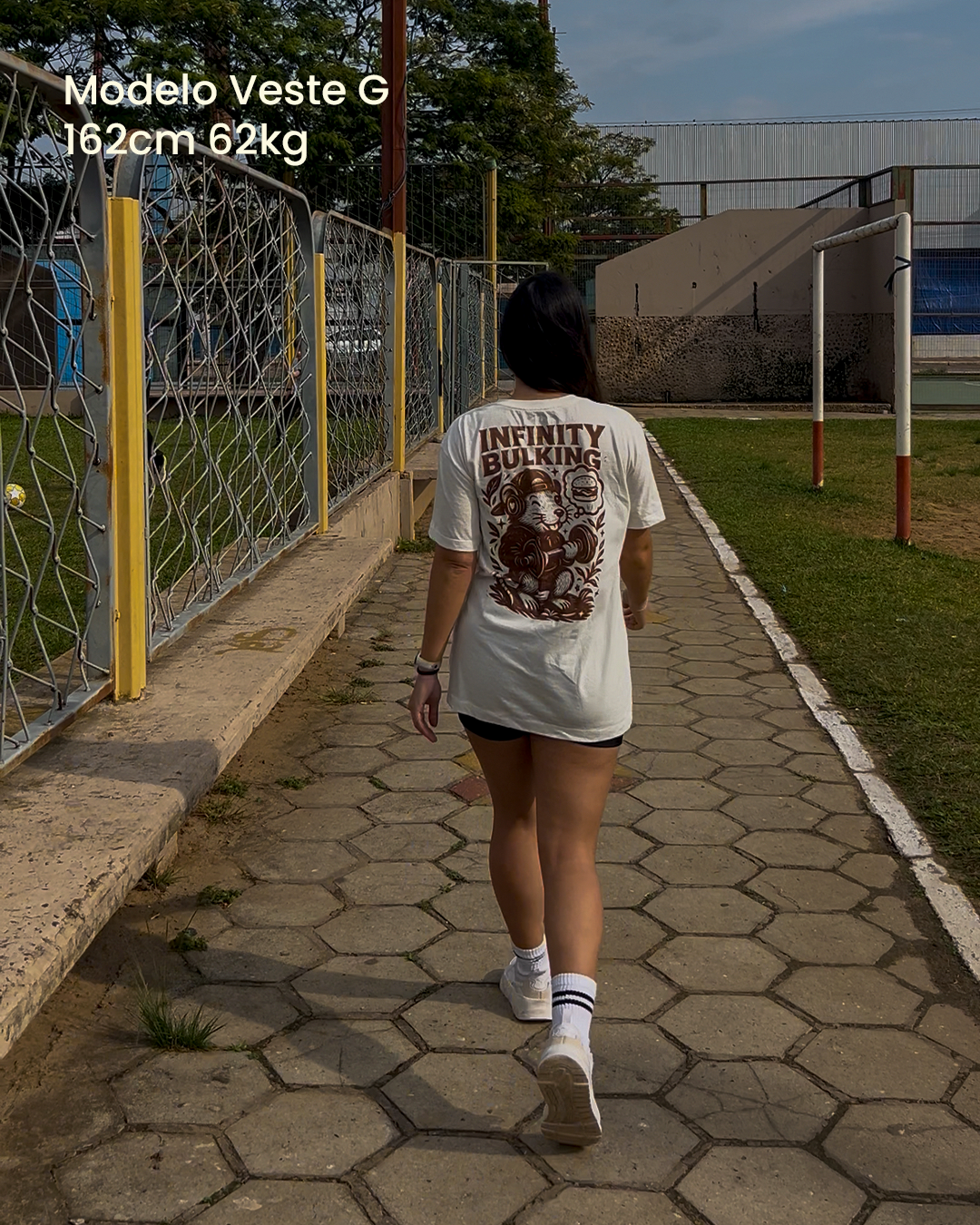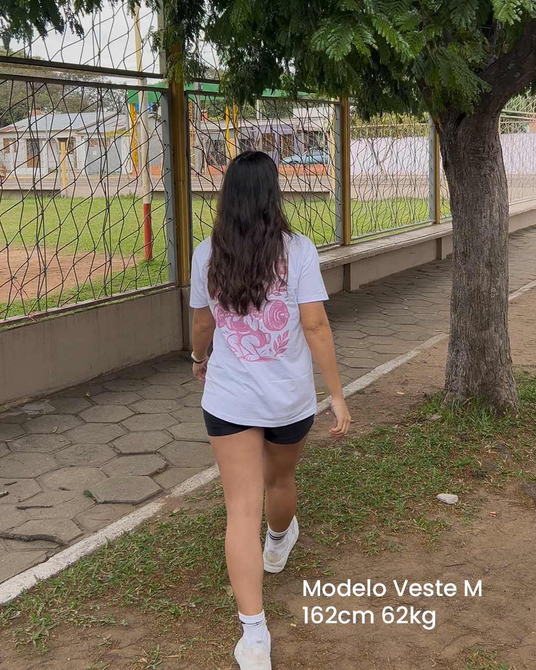 Modelo 162cm de altura e 62 kg usando tamanho P